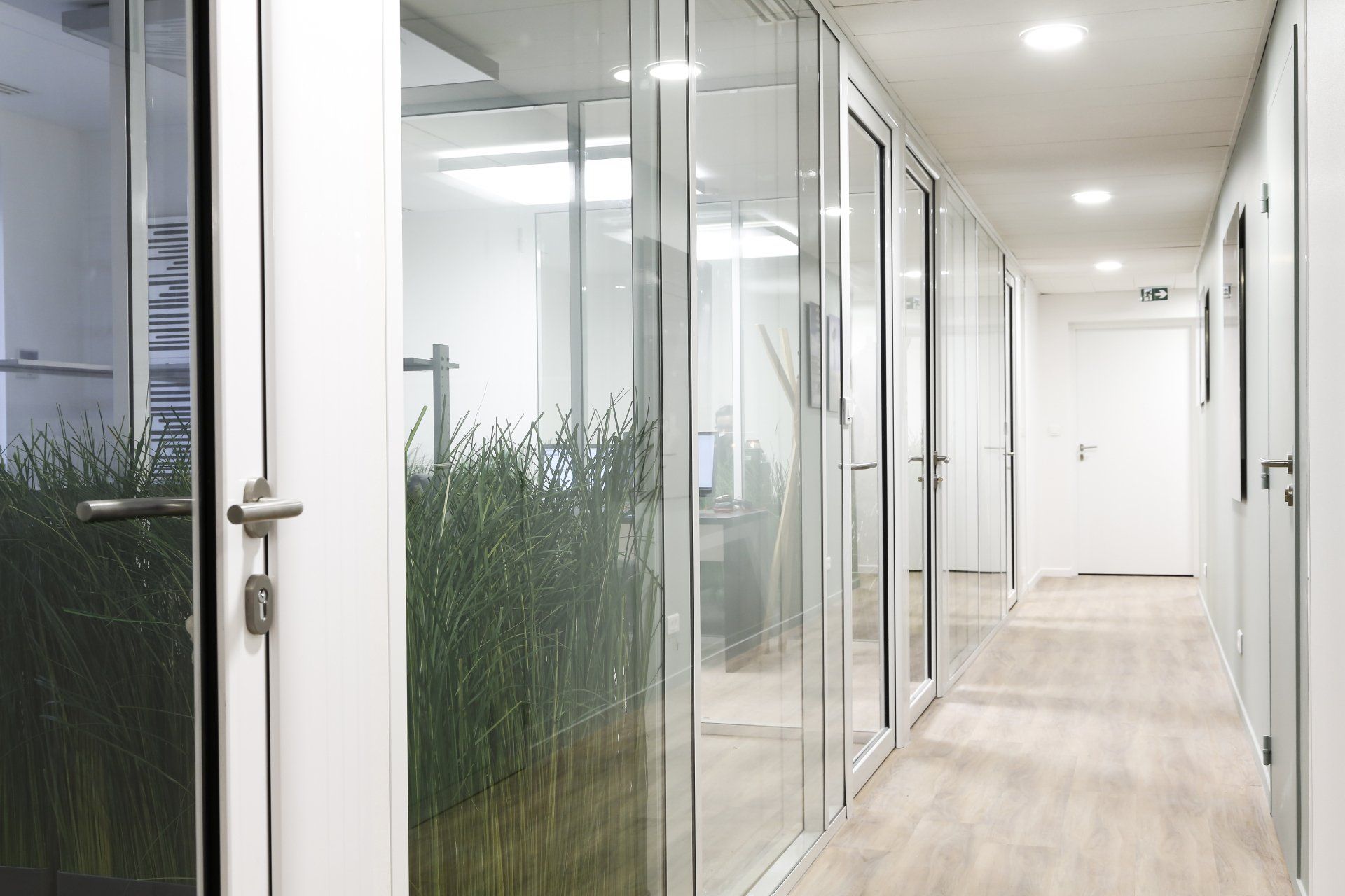 La cloison vitrée apporte une sensation d'espace et de lumière. Elle peut rester transparente avec un système de store ou bien être polie, revêtue de vitrophanie...